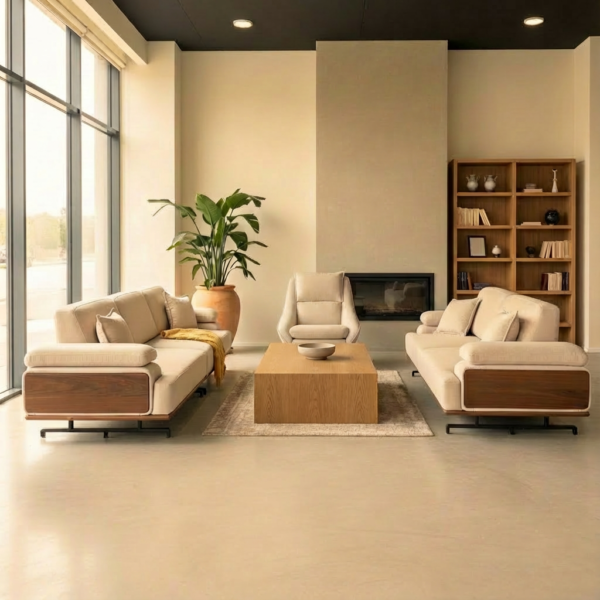Ky set ka konfigurim 4+3+1 dhe është bërë me material thesi ngjyrë krem, i detajuar me dru në ansore për stil dhe kontrast elegant.