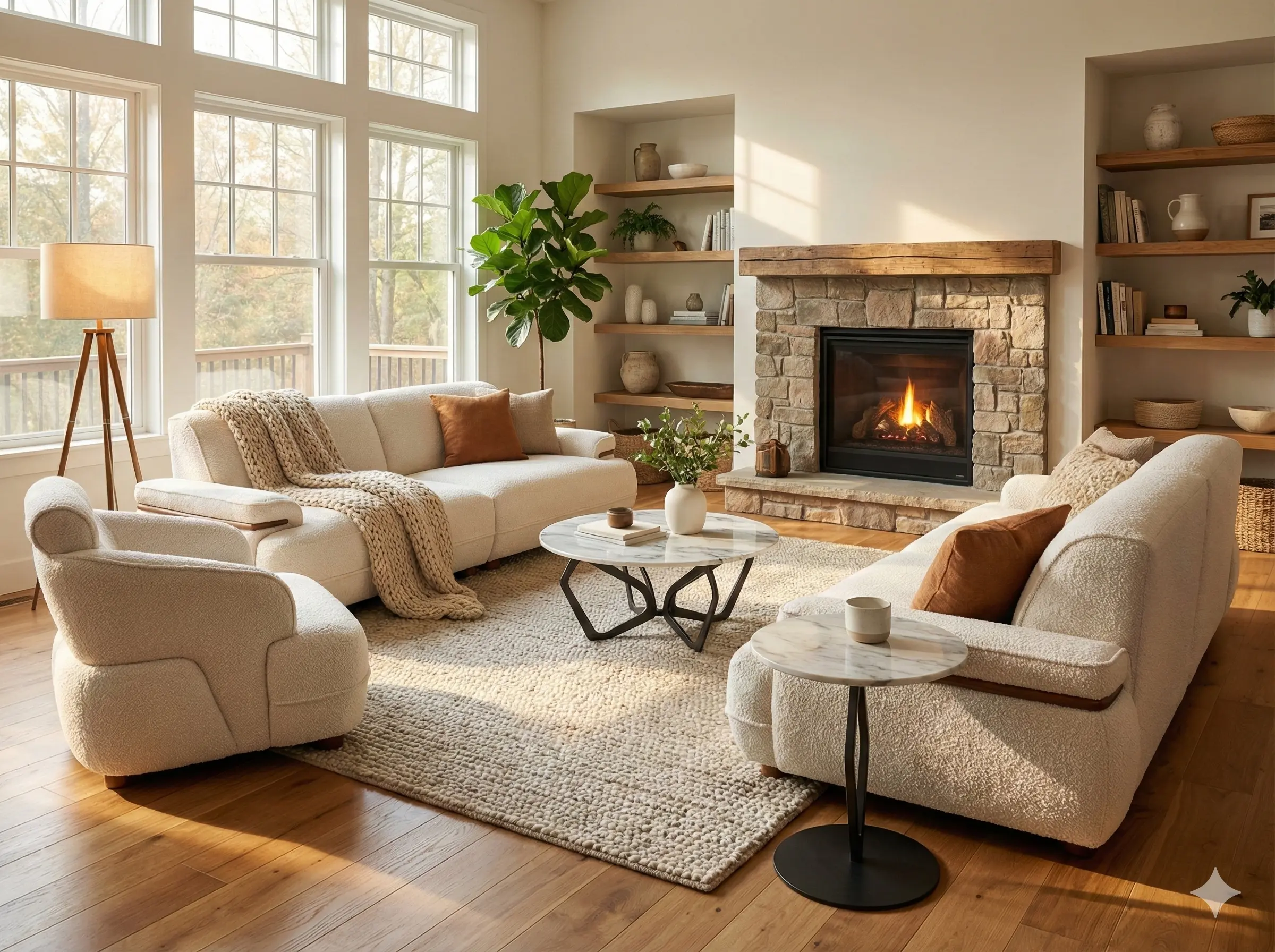 Ky set ka konfigurim 4+3+1 dhe është bërë me material pelushi ngjyrë krem, i detajuar me dru në ansore për kontrast stilistik dhe elegancë.